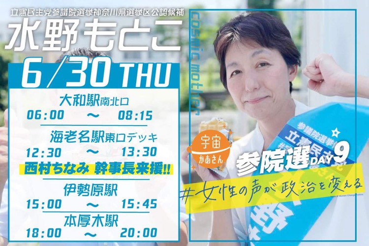 2022年6月30日(木)、大和駅、海老名駅、伊勢原駅、本厚木駅に、水野もとこがご挨拶にお伺い致します。
